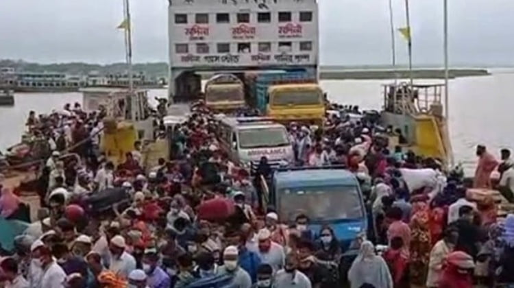 অনুপম নিউজ ডেস্ক: মানুষ ছুটছে গ্রামের দিকে। কারণ সোমবার থেকে দেশজুড়ে কঠোর লকডাউন। শনিবার ২৬ জুন সকাল থেকে দেশের বিভিন্ন ফেরিঘাটে যাত্রীদের ভিড় ও ব্যক্তিগত যানবাহনের চাপ ছিল চোখে পড়ার মতো।