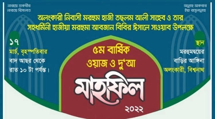 অলংকারী নিবাসী মরহুম হাজী তছলম আলী ও তাঁর স্ত্রী হাজিয়া মরহুমা আবজান বিবির ঈসালে ছওয়াব উপলক্ষে এ ওয়াজ ও দোয়া মাহফিল ঐদিন প্রয়াত দু’জনের বাড়ির আঙিনায় বাদ আছর থেকে রাত দশটা পর্যন্ত অনুষ্ঠিত হবে।