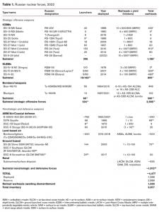 অনুমান করা হয়, এর মধ্যে প্রায় ১৫০০ ওয়ারহেডের বয়স অনেক বেশি হওয়ায় সেগুলো নিষ্ক্রিয় হয়ে গেছে। বাকি সাড়ে ৪ হাজারের বেশি অস্ত্রের মধ্যে বেশিরভাগই কৌশলগত পারমাণবিক অস্ত্র হিসেবে বিবেচনা করা হয়। এগুলো মূলত ব্যালিস্টিক ক্ষেপণাস্ত্র বা রকেট জাতীয়, যা অনেক দূরের লক্ষ্যবস্তুতে আঘাত করতে পারে।