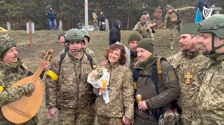 এতে দেখা গেছে, সামরিক পোশাক পরেই বিয়ের আনুষ্ঠানিকতা সম্পন্ন করছেন তারা। তাদের চারপাশে ইউক্রেনের সামরিক বাহিনীর সদস্যরা রয়েছেন।