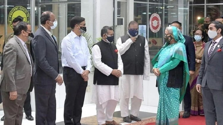 পররাষ্ট্রমন্ত্রী ড. এ কে আব্দুল মোমেন, বাণিজ্যমন্ত্রী টিপু মুনশি, প্রবাসী কল্যাণ ও বৈদেশিক কর্মসংস্থান মন্ত্রী ইমরান আহমদ, প্রধানমন্ত্রীর বেসরকারি শিল্প ও বিনিয়োগ বিষয়ক উপদেষ্টা সালমান এফ রহমান এবং মহিলা ও শিশু বিষয়ক প্রতিমন্ত্রী ফজিলাতুন নেসা ইন্দিরা প্রধানমন্ত্রীর সঙ্গে ছিলেন।