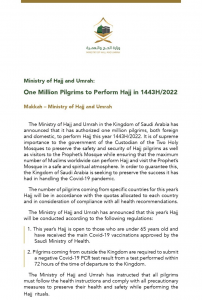 উল্লেখ্য, করোনা মহামারীর কারণে গত বছর সীমিতসংখ্যক হজযাত্রী হজ পালন করেছিলেন। সৌদি সরকারের তথ্যানুযায়ী, গত বছর ৫৮ হাজার ৭৪৫ জন হজ পালন করেছেন। মহামারীর আগের বছরগুলোতে হাজীর সংখ্যা ২০ লাখের বেশি হতো। ২০১৯ সালে সারা বিশ্ব থেকে ২৫ লাখ মানুষ পবিত্র হজ পালনের সুযোগ পেয়েছিলেন।