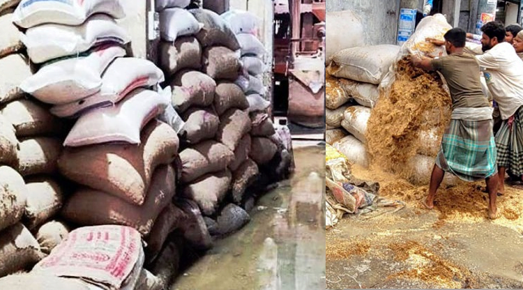 মজুদ রাখা ৫০ কেজির হাজারো বস্তা চাল এবং ২ মন ওজনের ধানের বস্তার স্তুপ ভিজে পচন ধরেছে