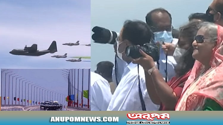 এসময় মাঝ সেতুতে দাঁড়িয়ে বিমান বাহিনীর ৩১টি বিমান ও হেলিকপ্টারের সমন্বয়ে এক মনোজ্ঞ ‘ফ্লাইং ডিসপ্লে’র উপভোগ করেন তিনি। সঙ্গে প্রধানমন্ত্রীর কন্যা সায়েমা ওয়াজেদ পুতুলসহ অন্যরা।
