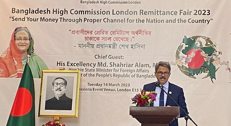 পররাষ্ট্র প্রতিমন্ত্রী মোঃ শাহরিয়ার আলম গত মঙ্গলবার লন্ডনে প্রথবারের মতো বাংলাদেশ হাই কমিশন আয়োজিত রেমিট্যান্স মেলায় প্রধান অতিথির বক্তব্যে বৈধ পথে রেমিটেন্স পাঠানোর জন্য ব্রিটিশ-বাংলাদেশিদের প্রতি আহ্বান জানিয়ে বলেন, “বাংলাদেশে প্রবাসিদের প্রেরিত অর্থ সুরক্ষিত থাকবে এবং এই অর্থ থেকে সরকারি প্রণোদনাসহ সঞ্চয় ও বিনিয়োগের মাধ্যমের অন্যান্য দেশের তুলনায় বেশি মুনাফা অর্জনের সুযোগ রয়েছে।”