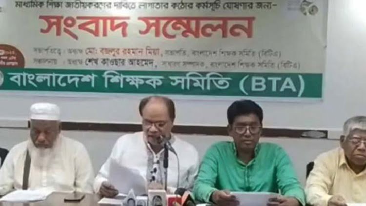 বিটিএ সভাপতি বলেন, দ্রুত জাতীয় শিক্ষানীতি-২০১০ বাস্তবায়ন, শিক্ষায় বিনিয়োগে ইউনেস্কো ও আইএলওর সুপারিশসমূহ বাস্তবায়ন এবং সবার জন্য শিক্ষা গ্রহণের সমান সুযোগ নিশ্চিত করতে মাধ্যমিক শিক্ষা জাতীয়করণ এখন সময়ের দাবি।