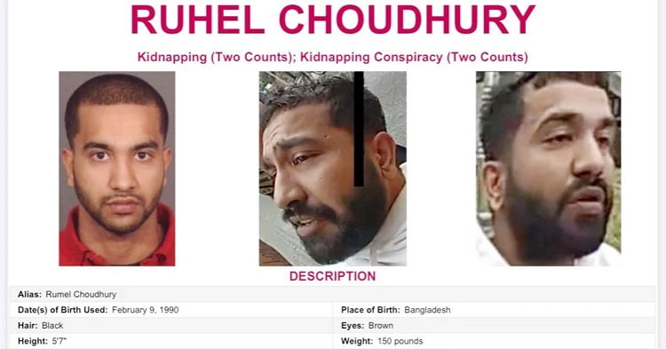 প্রতিবেদনে বলা হয়েছে, গত বছর কুইন্সের রাস্তা থেকে দু’জনকে অপহরণের ঘটনায় জড়িত সাতজন সন্দেহভাজনের মধ্যে ৩৪ বছর বয়সী রুহেল চৌধুরী হচ্ছে শেষ ব্যক্তি। এছাড়া ৩৪ বছর বয়সী এই বাংলাদেশিকে ধরিয়ে দিতে গত ১ মার্চ এফবিআই একটি পোস্টারও প্রকাশ করে।