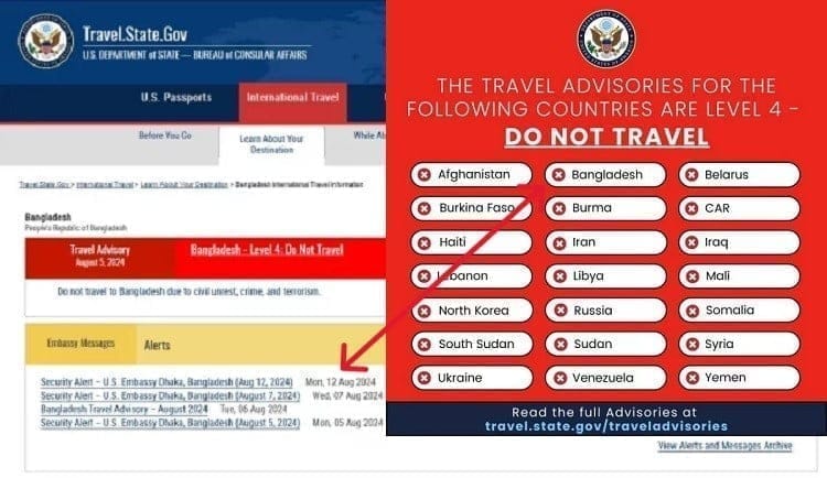 মার্কিনপররাষ্ট্র দপ্তরের ওয়েবসাইট ও এক্স হ্যান্ডেলে প্রকাশ করা এক তালিকায় এ তথ্য পাওয়া যায়। এতে বাংলাদেশসহ ২১টি দেশকে লাল তালিকাভুক্ত করে চতুর্থ পর্যায়ের ভ্রমণ সতর্কতা জারির কথা জানানো হয়েছে। এটিই আমেরিকার সর্বোচ্চ পর্যায়ের ভ্রমণ সতর্কতা। মার্কিন নাগরিকদের পরবর্তী নির্দেশ না দেওয়া পর্যন্ত এই দেশগুলো ভ্রমণ না করতে পরামর্শ দেওয়া হয়েছে।