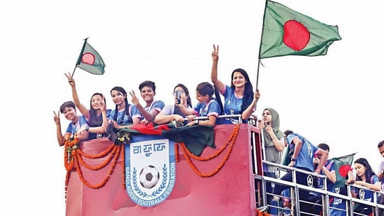 টানা দ্বিতীয়বারের মতো সাফ নারী চ্যাম্পিয়নশিপের শিরোপা জিতে বৃহস্পতিবার ট্রফি নিয়ে নেপাল থেকে দেশে ফেরার পর ছাদ-খোলা বাসে চড়ে বাংলাদেশ ফুটবল ফেডারেশনে (বাফুফে) পৌঁছায় মেয়েরা। সেখানে তারা সিক্ত হয় জমকালো সংবর্ধনায়।