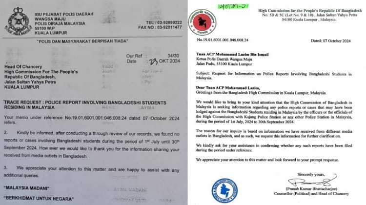 অভিযোগের সূত্র ধরে গত ৭ অক্টোবর ২০২৪ তারিখে, ১৯.০১.৬০০১.০০১.০৪৬.০০৮.২৪ নং স্মারকে কুয়ালালামপুরের ওয়াংসা মাজুর পুলিশ প্রধান বরাবর এ বিষয়ে বিস্তারিত তথ্য জানতে পত্র লিখে মালেশিয়াস্থ বাংলাদেশ হাইকমিশন। হাইকমিশনের পত্রের ভিত্তিতে গত ২৩ অক্টোবর ২০২৪ তারিখে ওয়াংসা মাজু এরিয়ার পুলিশ প্রধান, শায়রুল আনোয়ার বিন আব্দুল ওয়াহাব স্বাক্ষরিত রিপোর্ট বলছে, গত ১ জুলাই, ২০২৪ থেকে ৩০ সেপ্টেম্বর, ২০২৪ পর্যন্ত বাংলাদেশি শিক্ষার্থীদের বিরুদ্ধে হাইকমিশন কর্তৃক, কাজাং তথা মালয়েশিয়ার কোনো থানায় মামলা হয়নি।