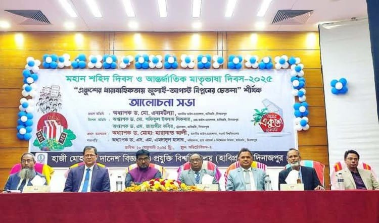মোহাম্মদ মুরাদ হোসেন, হাবিপ্রবি, দিনাজপুর: হাজী মোহাম্মদ দানেশ বিজ্ঞান ও প্রযুক্তি বিশ্ববিদ্যালয়ে (হাবিপ্রবি) মহান শহিদ দিবস ও আন্তজার্তিক মাতৃভাষা দিবস ২০২৫ উপলক্ষ্যে “অমর একুশের ধারাবাহিকতায় জুলাই-আগস্ট বিপ্লবের চেতনা” শীর্ষক আলোচনা সভা অনুষ্ঠিত হয়েছে।