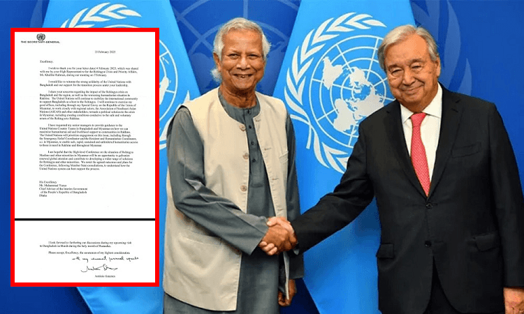 প্রধান উপদেষ্টা অধ্যাপক ড. মুহাম্মদ ইউনূসকে ২৫ ফেব্রুয়ারি পাঠানো ওই চিঠিতে গুতেরেস জানান, রোহিঙ্গা সংকটের কারণে বাংলাদেশ ও এ অঞ্চলের ওপর পড়া প্রভাব এবং রাখাইনে ক্রমবর্ধমান মানবিক সংকট নিয়ে তিনি বাংলাদেশের প্রধান উপদেষ্টার উদ্বেগের সঙ্গে একমত।