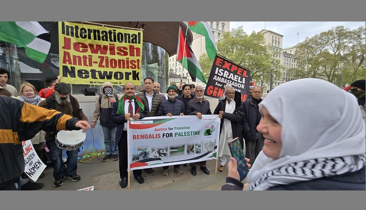 লন্ডন অফিস: সন্ধ্যায় ইন্টারন্যাশনাল জুয়িশ এন্টি জায়োনিজম নেটওর্য়াক (আইজেএএন) আয়োজিত একটি বিক্ষোভে বিক্ষোভকারীরা লন্ডনের নিউ স্কটল্যান্ড ইয়ার্ডের বাইরে জড়ো হয়ে ইসরায়েলি রাষ্ট্রদূত জিপি হোটোভেলি এবং গাজায় যুদ্ধাপরাধের জন্য দায়ীদের গ্রেপ্তারের দাবি জানিয়েছেন।