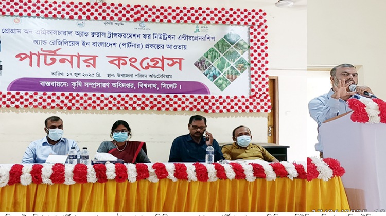 বিশ্বনাথ প্রতিনিধি: ‘প্রোগ্রাম অন এগ্রিকালচারাল অ্যান্ড রুরাল ট্রান্সফরমেশন ফর নিউট্রিশন এন্টারপ্রেনরশিপ অ্যান্ড রেজিলিয়েন্স ইন বাংলাদেশ’ (পার্টনার) প্রকল্পের আওতায় সিলেটের বিশ্বনাথে পার্টনার কংগ্রেস অনুষ্ঠিত হয়েছে। মঙ্গলবার (১৭ জুন) দুপুরে উপজেলা পরিষদ অডিটোরিয়ামে এ অনুষ্ঠানে কৃষি প্রযুক্তির উন্নয়ন, উদ্যোক্তা উন্নয়ন, পুষ্টি নিরাপত্তা, স্থিতিশীলতা বৃদ্ধি, বাজার সংযোগ বিষয়ে কৃষকদের প্রশিক্ষণ দেয়া হয়।