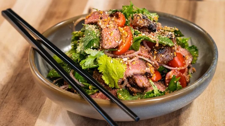 এবার ভাজা মাংস, পেঁয়াজ কুচি, টমেটো, শসা, পুদিনা, গোলমরিচের গুঁড়া সালাদ ড্রেসিংয়ের সঙ্গে মিশিয়ে থাই বিফ সালাদ বানিয়ে নিন।