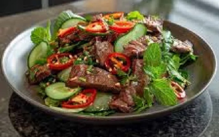 আধা কেজি গরুর মাংসের বড় টুকরা বেকিং পাউডার দিয়ে মেখে অল্প তেলে ভেজে নিন। ভাজা হলে পাতলা করে কেটে নিন। চাইলে পাতলা ছোট টুকরা করেও ভেজে নিতে পারেন। সালাদ ড্রেসিংয়ের জন্য ১ চা চামচ রসুন কুচি, লাল কাঁচামরিচের কুচি, ২ চা চামচ লেবুর রস, ১ চা চামচ ফিশ সস, ১ চা চামচ জলপাই, তেল, সামান্য চিনি একসঙ্গে মিশিয়ে নিন। টমেটো ও শসার বিচি ফেলে টুকরা করুন।