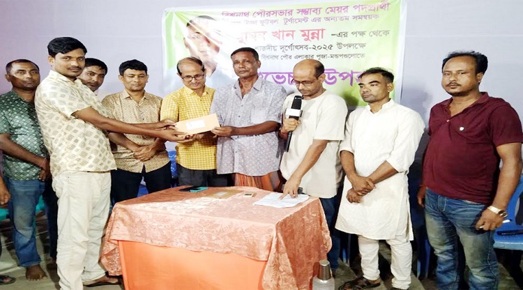 শুক্রবার (২৬ সেপ্টেম্বর) সন্ধ্যায় পৌর শহরের পুরান বাজার এলাকাস্থ শ্রী শ্রী শনি মন্দির প্রাঙ্গণে অনুষ্ঠিত পূজা উপলক্ষ্যে ‘শুভেচ্ছা উপহার’ বিতরণ অনুষ্ঠানে মুমিন খান মুন্নার পক্ষ থেকে সবকটি পূজামন্ডপ কমিটির নেতৃবৃন্দের হাতে এই আর্থিক উপহার তুলে দেয়া হয়।