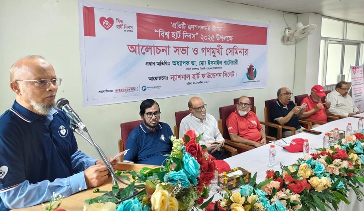 বিশ্ব হার্ট দিবস ২০২৫ উপলক্ষে ন্যাশনাল হার্ট ফাউন্ডেশন সিলেট আয়োজিত আলোচনা সভায় বক্তব্য রাখছেন সিলেট মেডিকেল বিশ্ববিদ্যালয়ের ভাইস চ্যান্সেলর অধ্যাপক ডা. মোঃ ইসমাইল পাটোয়ারী।