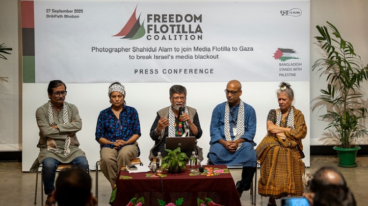 ফ্লোটিলায় যোগ দিতে ২৮ সেপ্টেম্বর রওনা হওয়ার আগে ঢাকায় সংবাদ সম্মেলনে শহীদুল আলম।
