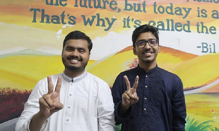 চাকসুতে বিজয়ী ছাত্রশিবির–সমর্থিত ‘সম্প্রীতির শিক্ষার্থী জোট’ প্যানেলের ভিপি প্রার্থী মো. ইব্রাহিম হোসেন (বাঁয়ে) ও জিএস সাঈদ বিন হাবিব