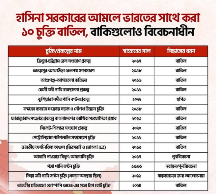 আসিফের পোস্টে যেসব বাতিল হওয়া চুক্তি ও প্রকল্পের নাম রেখেছেন, সেগুলো হচ্ছে- ত্রিপুরা-চট্টগ্রাম রেল সংযোগ প্রকল্প, অভয়পুর-আখাউড়া রেলপথ সম্প্রসারণ, আশুগঞ্জ-আগরতলা করিডর, ফেনী নদী পানি ব্যবস্থাপনা প্রকল্প, বন্দরের ব্যবহার সংক্রান্ত সড়ক ও নৌপথ উন্নয়ন চুক্তি, ফারাক্কাবাদ সংক্রান্ত প্রকল্পে বাংলাদেশের আর্থিক সহযোগিতা প্রস্তাব, সিলেট-শিলচর সংযোগ প্রকল্প, পেট্রোলিয়াম পাইপলাইন সম্প্রসারণ চুক্তি, ভারতীয় অর্থনৈতিক অঞ্চল (মিরসরাই ও মোংলা আইইজেড) এবং ভারতীয় প্রতিরক্ষা কোম্পানি জিআরএসইর সঙ্গে টাগ বোট চুক্তি।