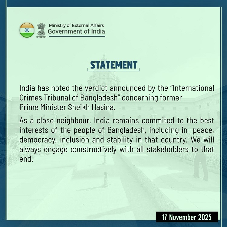 সোমবার (১৭ নভেম্বর) শেখ হাসিনার বিরুদ্ধে রায় ঘোষণার কয়েক ঘণ্টার মধ্যে ভারতের পররাষ্ট্র মন্ত্রণালয় এক বিবৃতিতে ওই প্রতিক্রিয়া জানিয়েছে।