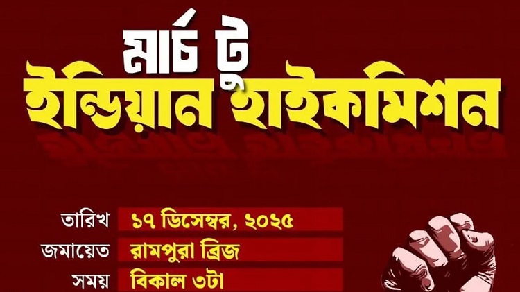 অনুপম নিউজ ডেস্ক: ভারতে অবস্থানরত জুলাই গণহত্যার পর ছাত্র–জনতার অভ্যুত্থানে ক্ষমতাচ্যুত সাবেক প্রধানমন্ত্রী শেখ হাসিনাসহ হত্যাকাণ্ডে জড়িতদের দেশে ফিরিয়ে দেওয়ার দাবিতে এবং ভারতীয় প্রক্সি, রাজনৈতিক দল, গণমাধ্যম ও সরকারি কর্মকর্তাদের অব্যাহত ষড়যন্ত্রের অভিযোগে ‘মার্চ টু হাইকমিশন’ কর্মসূচি ঘোষণা করেছে জুলাই ঐক্য। বুধবার (১৭ ডিসেম্বর) দুপুর ৩টায় এই কর্মসূচি পালন করা হবে।