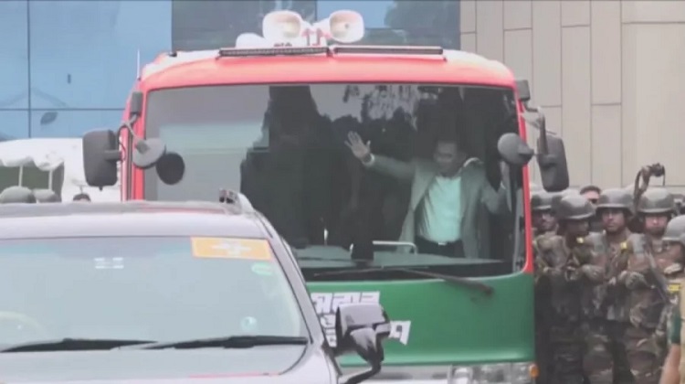 বিমান বন্দর থেকে লাল সবুজ রঙের বাসে চড়ে যাচ্ছেন ৩০০ ফিট এলাকায় সমাবেশ স্থলে।